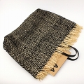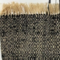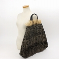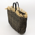 ラフィアコットン布バッグ 革ハンドル縁フリンジ ひし形黒