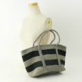 サイザルバッグ四角底トートミニ 平ハンドルぐるり ボーダー グレーx黒