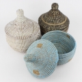 セネガル 蓋付きカゴ ラメ糸四角モチーフ サックスゴールド 小